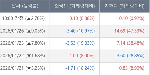 [장중수급포착] 유티아이, 외국인/기관 동시 순매수… 주가 +2.70%