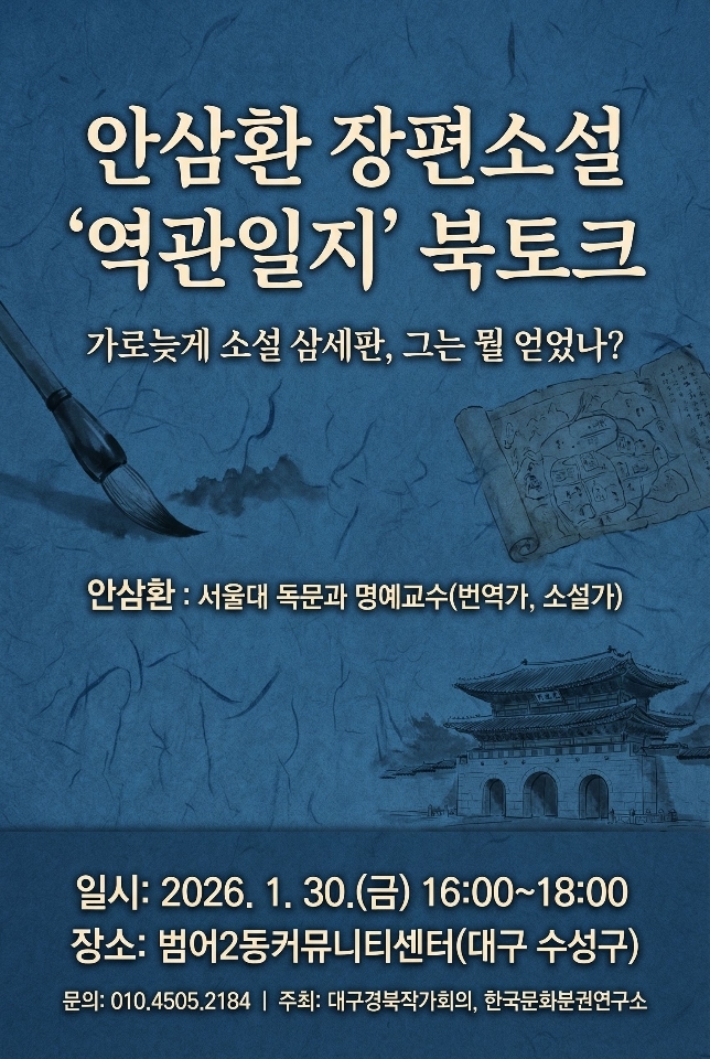 [대구=뉴스핌] 김용락 기자 = 독문학 번역자와 소설가로 유명한 경북 영천 출신 안삼환 서울대 명예교수가 오는 30일 오후 4시 범어2동커뮤니티센터(대구 수성구)에서 자신의 장편소설 '역관 일지'(부북스) 출간 기념 북토크 '가로늦게 소설 삼세판, 그는 뭘 얻었나?'를 개최한다. 북토크 제목 '가로늦게 소설 삼세판, 그는 뭘 얻었나?'는 안 교수가 정년 퇴직한 후 이번에 낸 소설이 세 번째 소설을 뜻하는 것으로 그는 이전에 이미 두 권의 소설책을 출간 한 바 있다.