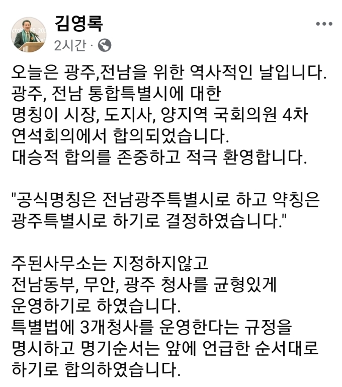 [무안=뉴스핌] 조은정 기자 =  김영록 전남도지사는 27일 "광주·전남 통합특별시의 공식 명칭을 '전남광주특별시'로 하고 약칭은 '광주특별시'로 하기로 합의했다"며 "시장·도지사, 양 지역 국회의원이 참여한 4차 연석회의에서 이 같은 결론에 도달했다"고 밝혔다.