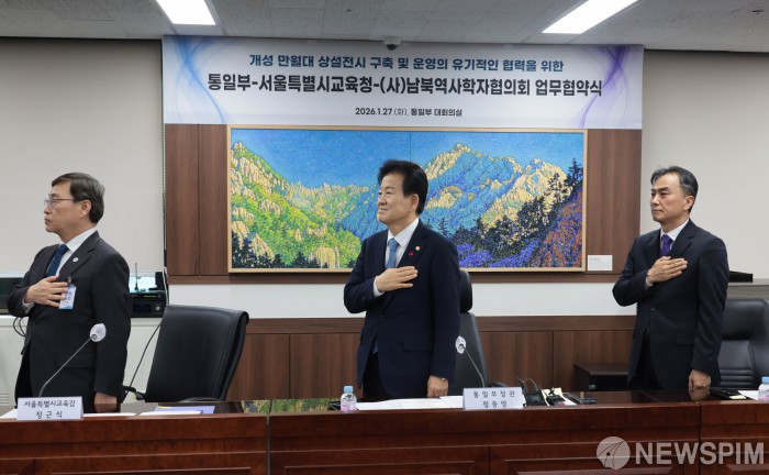 [서울=뉴스핌] 이길동 기자 = 정근식(왼쪽부터) 서울시교육감, 정병욱 남북역사학자협의회 이사장, 정동영 통일부 장관이 27일 서울 종로구 정부서울청사에서 열린 개성 만월대 상설전시 구축 및 운영의 유기적인 협력을 위한 통일부-서울특별시교육청-(사)남북역사학자협의회 업무협약식에서 국기에 경례하고 있다. 2026.01.27 gdlee@newspim.com