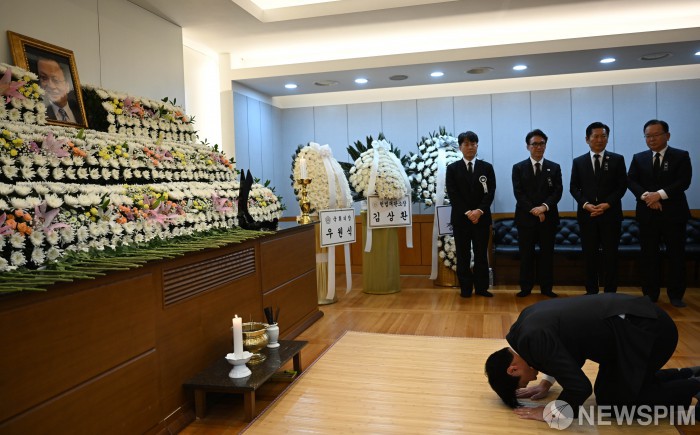[서울=뉴스핌] 사진공동취재단 = 한준호 더불어민주당 의원이 27일 서울 종로구 서울대학교병원 장례식장에 마련된 이해찬 민주평화통일자문회의 수석부의장의 빈소를 조문하고 있다. 2026.01.27 photo@newspim.com