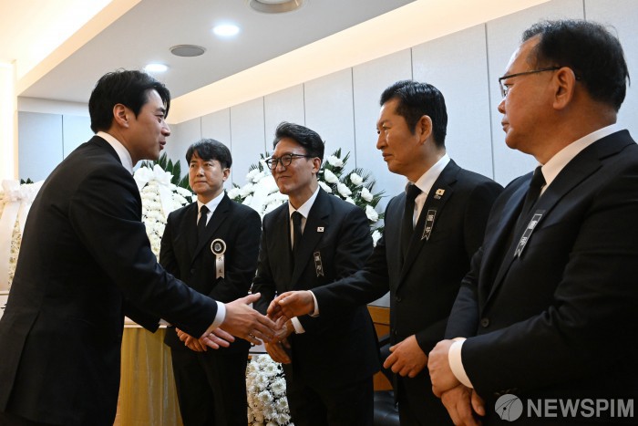 [서울=뉴스핌] 사진공동취재단 = 한준호 더불어민주당 의원이 27일 서울 종로구 서울대학교병원 장례식장에 마련된 이해찬 민주평화통일자문회의 수석부의장의 빈소에서 정청래 대표와 인사를 나누고 있다. 2026.01.27 photo@newspim.com