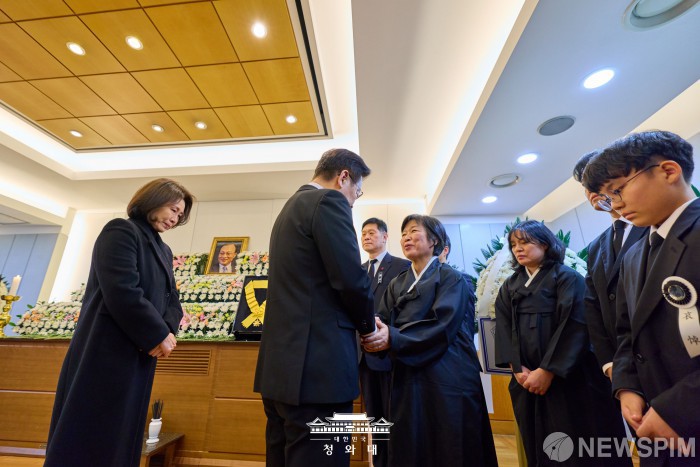 [서울=뉴스핌] 이재명 대통령이 지난 27일 서울 종로구 서울대학교병원 장례식장에 마련된 고(故) 이해찬 전 국무총리의 빈소에서 유가족을 위로하고 있다. [사진=대통령실] 2026.01.28 photo@newspim.com