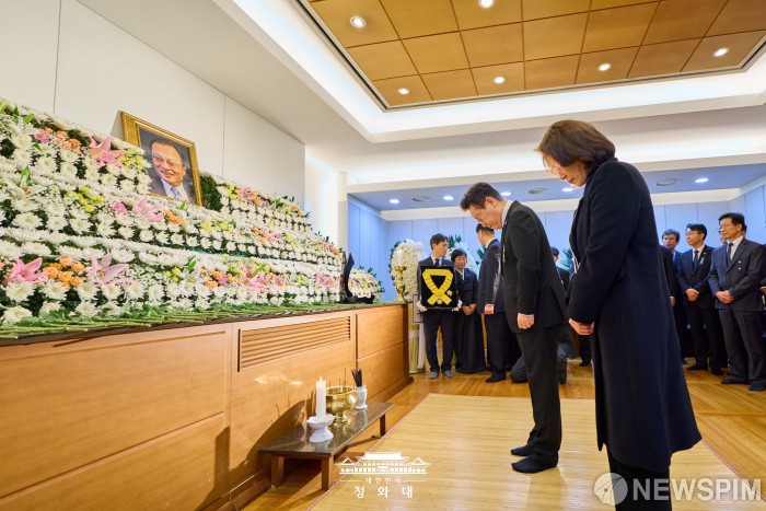 [서울=뉴스핌] 이재명 대통령이 지난 27일 서울 종로구 서울대학교병원 장례식장에 마련된 고(故) 이해찬 전 국무총리의 빈소를 조문하고 있다. [사진=대통령실] 2026.01.28 photo@newspim.com