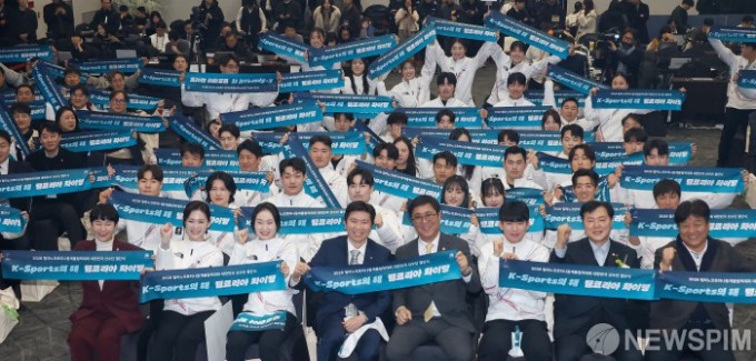 [서울=뉴스핌] 류기찬 기자 = 최휘영 문화체육관광부 장관, 유승민 대한체육회장 등 선수단들이 22일 오후 서울 송파구 올림픽파크텔에서 열린 '2026 밀라노 동계올림픽 선수단 결단식'에서 기념촬영을 하고 있다. 2026.01.22 ryuchan0925@newspim.com