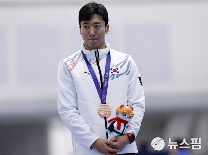 [하얼빈 로이터 =뉴스핌] 박상욱 기자 = 김준호가 2025년 2월 하얼빈 동계 아시안게임 스피드스케이팅 남자 500m에서 동메달을 목에 걸고 기념촬영을 하고 있다. 2025.2.10 psoq1337@newspim.com