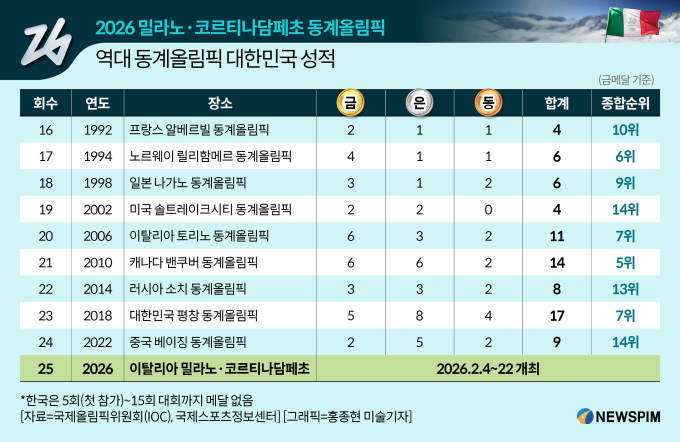 [서울=뉴스핌] 박상욱 기자 = 2026 밀라노·코르티나담페초 동계 올림픽에서 한국 선수단의 메달 레이스는 개회식인 2월 7일(한국시간) 다음 날부터 본격적으로 시작된다. 2022 베이징 동계 올림픽에서 금메달 2개, 은메달 5개, 동메달 2개로 종합 14위를 기록했던 한국은 이번 대회에서 금메달 3개 이상, 톱10 진입을 목표로 내세웠다.