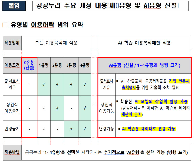 새로 도입된 '제0유형'은 출처 명시 의무조차 없는 완전 개방 형태다. 상업적 이용과 내용 변경이 모두 가능해 AI 기업들이 저작권 분쟁 걱정 없이 데이터를 가공하고 활용할 수 있는 토대가 마련됐다.
