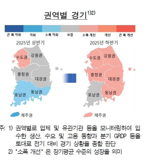권역별로 보면 수도권은 반도체 업황 호조가 지속되는 가운데 증시 활황에 따른 금융·보험업 성장으로 개선 흐름을 이어갔다. 동남권은 선박 생산 호조와 관광객 증가에 따른 숙박·음식점업, 운수업 회복으로 상반기 부진에서 벗어났다. 충청권은 철강 부진에도 불구하고 메모리 반도체와 프리미엄 디스플레이 생산 확대에 힘입어 소폭 개선됐다.