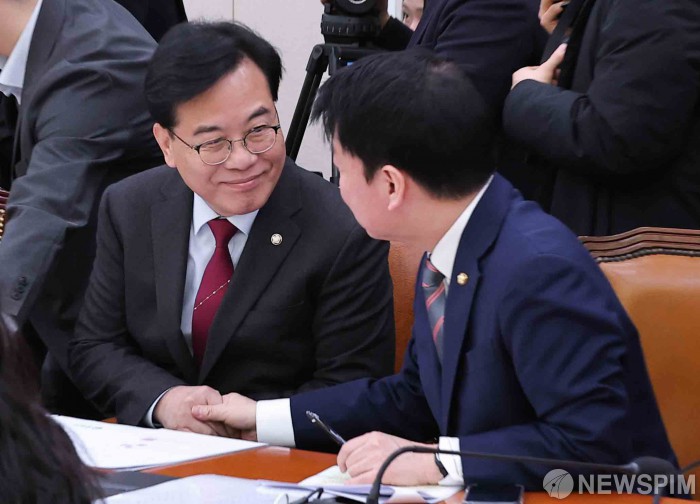 [서울=뉴스핌] 윤창빈 기자 = 송언석 국민의힘 원내대표, 안철수 국민의힘 의원이 28일 서울 여의도 국회에서 열린 외교통일위원회 전체회의에서 인사를 나누고 있다. 2026.01.28 pangbin@newspim.com