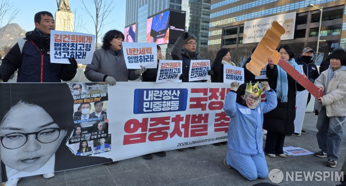 [서울=뉴스핌] 양윤모 기자 = 윤석열 전 대통령 부인 김건희 씨에 대한 1심 선고가 28일 오후 서울중앙지법 27 형사부(부장판사 우인성)에서 예정된 가운데, 전국민중행동 회원들이 서울 광화문광장 이순신 장군 동상 앞에서 '국정농단 김건희 엄중처벌 촉구' 퍼포먼스를 하고 있다. 2026.01.28 yym58@newspim.com