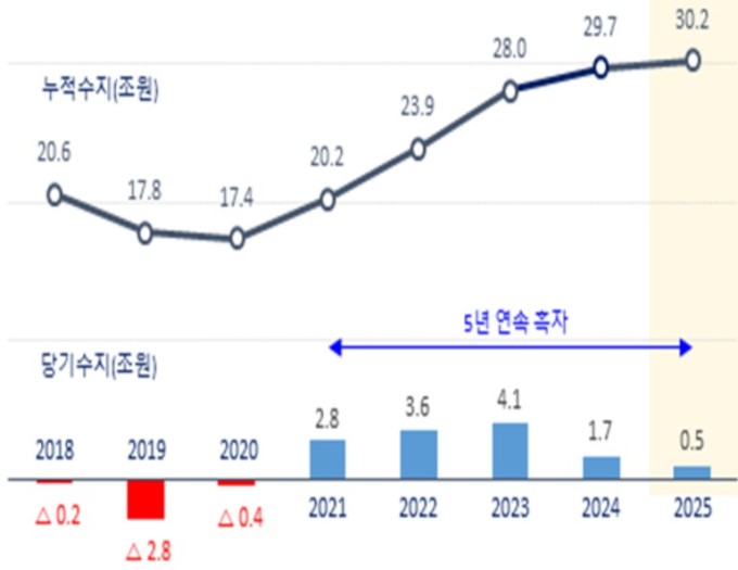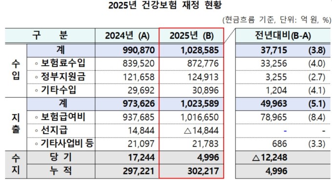 국민건강보험공단은 28일 2025년도 건강보험 재정이 현금흐름 기준으로 4996억원 당기수지 흑자로 집계되고 5년 연속 흑자재정을 유지하며 누적 준비금은 30조2217억원을 적립했다고 밝혔다.