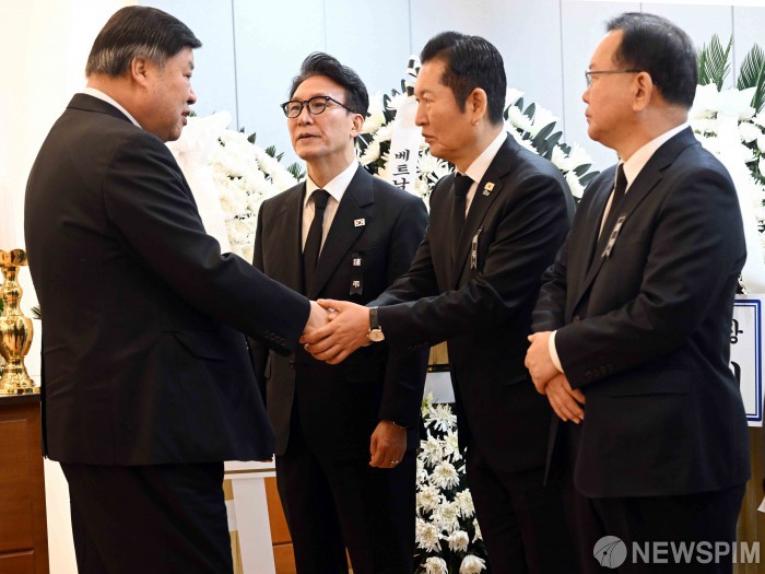 [서울=뉴스핌] 사진공동취재단 = 서정진 셀트리온 회장이 28일 오전 서울 종로구 서울대학교병원 장례식장에 마련된 故 이해찬 전 국무총리의 빈소에서 조문을 하고 김민석 총리와 정청래 민주당 대표와 인사하고 있다. 2026.01.28 photo@newspim.com