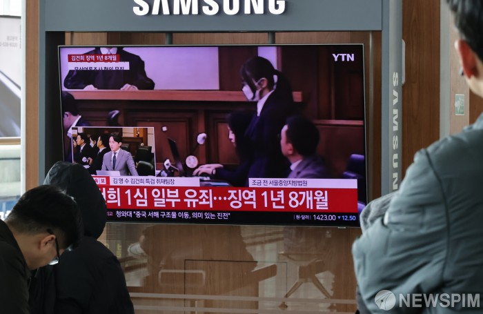 [서울=뉴스핌] 양윤모 기자 = 28일 오후 서울역 대합실을 찾은 시민들이 서울중앙지법 형사합의27부(부장판사 우인성)에서 진행되는 윤석열 전 대통령 부인 김건희 씨의 도이치모터스 주가조작과 명태균 공천개입, 통일교 청탁·뇌물 수수 의혹 혐의 등의 1심 선고 중계방송을 시청하고 있다. 재판부는 자본시장법 위반·알선수재·정치자금법 위반 등 혐의를 받는 김 여사에게 징역 1년 8개월과 추징금 약 1280만 원을 선고했다. 한편 재판부는 김 여사 혐의 중 도이치모터스 주가조작(자본시장법 위반), 명태균 여론조사(정치자금법 위반) 관련 혐의는 무죄로 판단했다.2026.01.28 yym58@newspim.com
