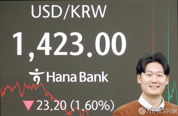 [서울=뉴스핌] 류기찬 기자 = 코스피가 5100선을 돌파 마감한 28일 오후 서울 중구 하나은행 딜링룸 전광판에 달러/원 환율이 표시되고 있다. 이날 코스피 지수는 전 거래일 대비 85.96포인트(1.69%) 오른 5170.81에, 달러/원 환율은 23.70원 내린 1422.50원에, 코스닥 지수는 50.93포인트(4.70%) 오른 1133.52에 장을 마감했다. 2026.01.28 ryuchan0925@newspim.com