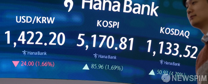 [서울=뉴스핌] 류기찬 기자 = 코스피가 5100선을 돌파 마감한 28일 오후 서울 중구 하나은행 딜링룸 전광판에 달러/원, 코스피, 코스닥 지수가 표시되고 있다. 이날 코스피 지수는 전 거래일 대비 85.96포인트(1.69%) 오른 5170.81에, 달러/원 환율은 23.70원 내린 1422.50원에, 코스닥 지수는 50.93포인트(4.70%) 오른 1133.52에 장을 마감했다. 2026.01.28 ryuchan0925@newspim.com