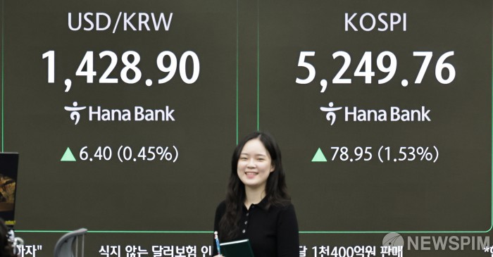 [서울=뉴스핌] 양윤모 기자 = 美연준이 금리를 3연속 인하 후 동결한 29일 오전 코스피가 전장 종가보다 78.95 포인트(1.53%) 상승하며 5249.76으로, 코스닥은 22.14 포인트(1.95%) 상승한 1155.66으로 장을 시작한 가운데, 서울 중구 하나은행본점 딜링룸에서 직원들이 업무를 보고 있다. 서울외환시장에서 달러/원 환율은 전장 대비 6.40원 상승한 1428.90원에 주간거래를 시작했다. 2026.01.29 yym58@newspim.com