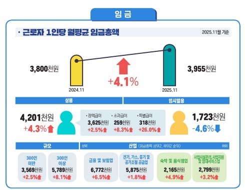 지난해 11월 기준 근로자 1인당 월평균 임금총액은 395만5000원으로 전년 동월보다 15만5000원(4.1%) 증가했다. 자동차 관련 산업 등에서 상여금이 지급되면서 상용근로자의 특별급여가 크게 늘어난 영향이다.