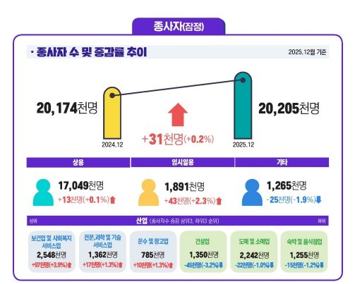 고용노동부는 이 같은 내용이 담긴 2025년 12월 사업체노동력 조사 결과를 29일 발표했다. 지난해 12월 기준 전체 종사자 수는 2020만5000명으로 집계됐다. 전년 동월(2017만4000명)보다 3만1000명(0.2%) 증가한 수준이다.