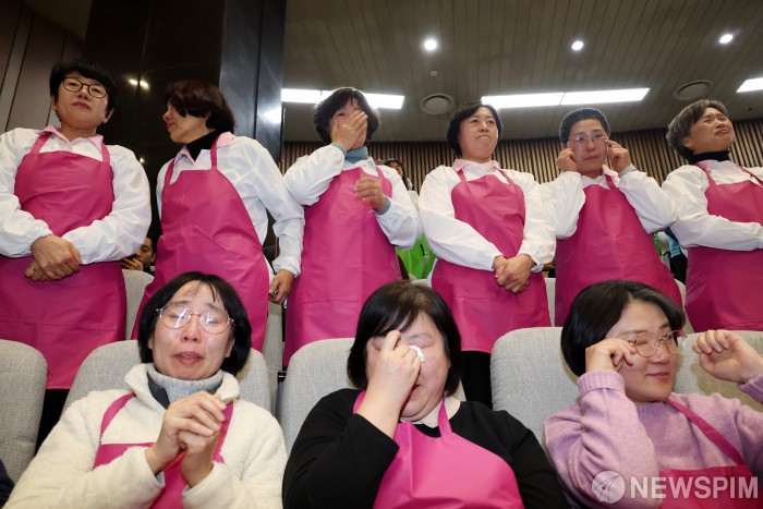 [서울=뉴스핌] 정일구 기자 = 29일 오후 서울 여의도 국회에서 열린 본회의에서 학교급식법 일부개정법률안(대안)이 가결되자 학교급식 노동자들이 환호하고 있다. 2026.01.29 mironj19@newspim.com