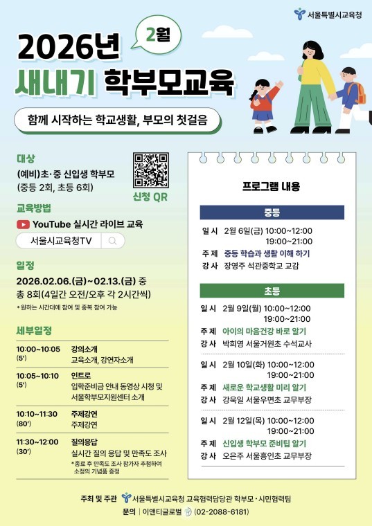 아울러 서울시교육청은 학부모가 원하는 시간과 장소에서 참여할 수 있도록 '2026 초·중 새내기 학부모 교육'을 온라인으로 운영한다. 교육은 초등학교 및 중학교 1학년 입학 예정 자녀의 학교 적응을 돕고, 학부모의 자녀 양육 역량을 높이기 위해 마련됐으며, 현직 초·중등 교사가 학교 현장의 경험을 바탕으로 실질적 내용을 중심으로 강의할 예정이다.