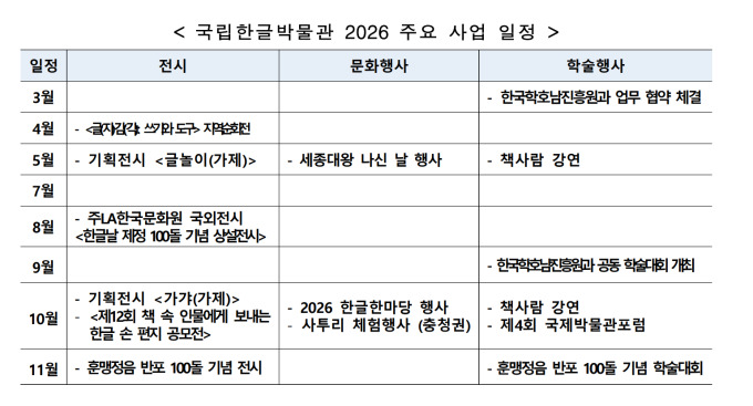 5월에는 세종대왕의 탄신일(5월 15일)을 계기로 '글놀이(가제)' 전시와 문화체험 축제가 경복궁 일대에서 개최될 예정이다. 이어 10월에는 '한글날 제정 100돌'과 '훈민정음 반포 580돌'을 기념하는 특별전 '가갸(가제)'와 국민참여형 축제 '2026 한글한마당'이 광화문광장 등지에서 열린다.