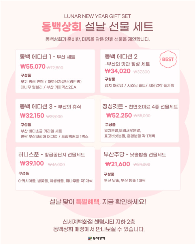 부산시와 부산경제진흥원은 동백상회에서 지역 우수 제품으로 구성한 설 '선물세트' 6종을 출시하고, 제품 구매 고객을 대상으로 한 사은품 증정 행사를 진행한다고 30일 밝혔다.
