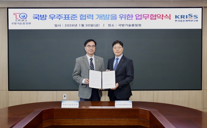 [서울=뉴스핌] 오동룡 군사방산전문기자 = 국방기술품질원은 30일 대전 국방신뢰성연구센터에서 한국표준과학연구원과 '국방 우주표준 협력 개발을 위한 양해각서(MOU)'를 체결하고, 우주 전자부품의 내방사선 보증 분야 표준 개발에 착수했다고 밝혔다.