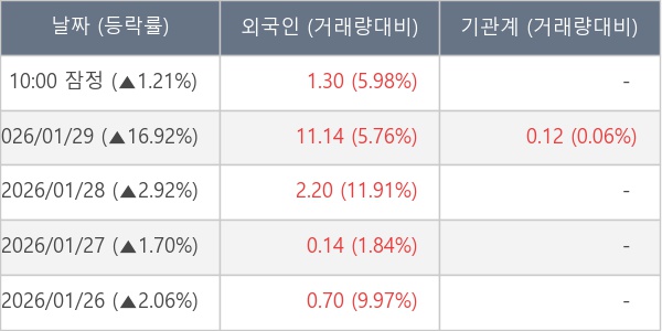 [서울=뉴스핌] 로보뉴스 = 30일 10시 15분 현재 제이티(089790)는 전일 대비 1.21% (현재가 5,840원) 상승했고, 외국인이 최근 5일 연속 순매수(누적 15.49만 주, 잠정) 행진을 하고 있다.