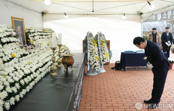 [무안=뉴스핌] 조은정 기자 = 김영록 전남도지사가 30일 무안군 남악복합주민센터에 마련된 고 이해찬 민주평통자문회의 수석부의장 분향소를 방문해 실·국장들과 조문하고 있다. [사진=전남도] 2026.01.30 ej7648@newspim.com