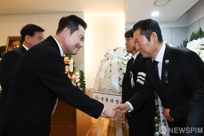 [서울=뉴스핌] 사진공동취재단 = 장동혁 국민의힘 대표가 30일 서울 종로구 서울대학교병원 장례식장에 마련된 고 이해찬 전 국무총리의 빈소에서 조문을 한 뒤 정청래 더불어민주당 대표와 악수하고 있다. 2026.01.30 photo@newspim.com