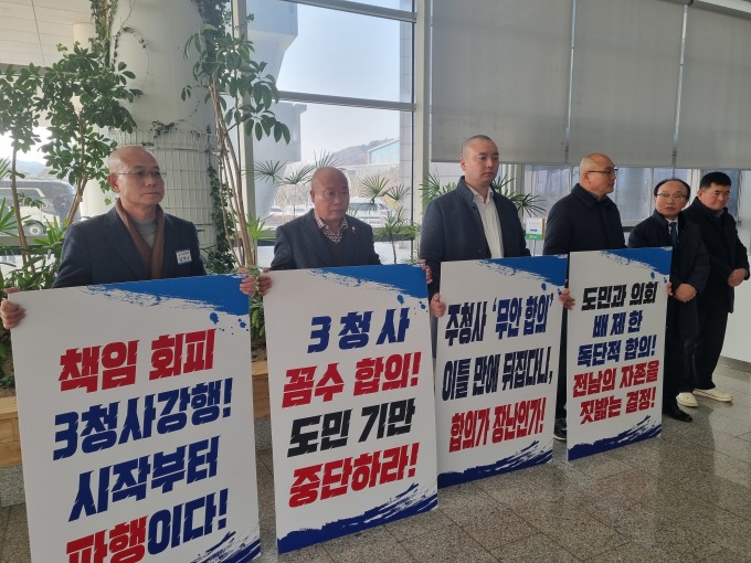 무안군의회는 29일 전남도청에서 열린 전남·광주 행정통합 의견수렴 간담회 참석에 앞서 도청 청사 앞에서 피켓 시위를 벌이며 "도민 뜻을 배제한 광주 중심 1극 체제 통합을 중단하라"고 주장했다.