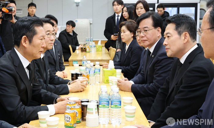 [서울=뉴스핌] 사진공동취재단 = 장동혁 국민의힘 대표(오른쪽 두번째)가 30일 오후 서울 종로구 서울대학교병원 장례식장에 마련된 고(故) 이해찬 전 국무총리의 빈소에서 조문을 마친 뒤 정청래 더불어민주당 대표와 대화를 나누고 있다. 2026.01.30. photo@newspim.com