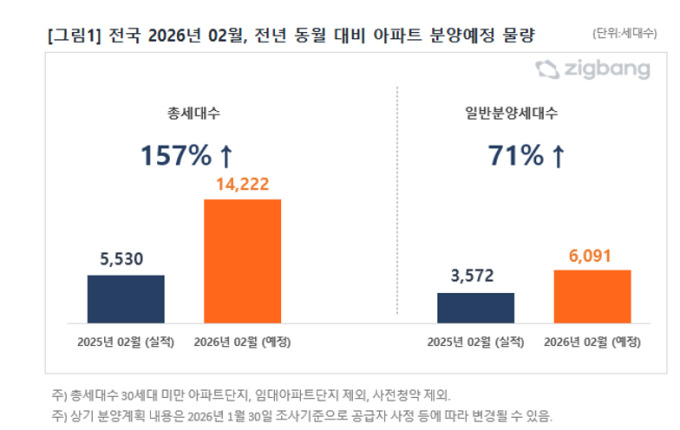 [서울=뉴스핌] 송현도 기자 = 직방이 2월 전국 아파트 분양 예정 물량이 총 1만4222가구로 집계했다고 2일 밝혔다. 이는 전년 동월(5530가구) 대비 약 157% 증가한 규모다. 일반분양 물량 역시 6091가구로 지난해 같은 기간(3572가구)보다 약 71% 늘었다.