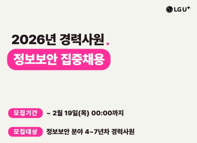 [서울=뉴스핌] 서영욱 기자 = 정보 유출 의혹을 받고 있는 LG유플러스가 정보보안 전 분야에서 경력 인재 채용을 확대하고 있다. 보안 인력 보강을 넘어 접근 통제와 관제, 점검, 데이터 관리 체계를 전반적으로 강화하려는 움직임으로 해석된다.