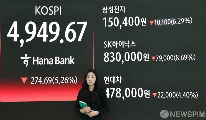 [서울=뉴스핌] 양윤모 기자 = 케빈 워시의 차기 미국 연방준비제도의장 지명 소식에 2일 오후 코스피가 전장 종가보다 274.69 포인트(5.26%) 하락하며 4949.67로, 코스닥은 51.08 포인트(4.44%) 하락한 1098.36으로 마감한 가운데, 서울 중구 하나은행본점 딜링룸에서 직원들이 업무를 보고 있다. 서울외환시장에서 달러/원 환율은 전장 대비 24.50원 상승한 1464.00원에 주간거래를 마감했다. 2026.02.02 yym58@newspim.com