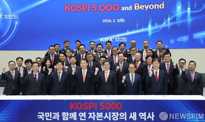 [서울=뉴스핌] 이형석 기자 = 이억원 금융위원장과 정은보 한국거래소 이사장을 비롯한 내빈들이 3일 오전 서울 여의도 한국거래소에서 열린 'KOSPI 5000 and Beyond' 세미나에서 기념촬영을 하고 있다. 2026.02.03 leehs@newspim.com