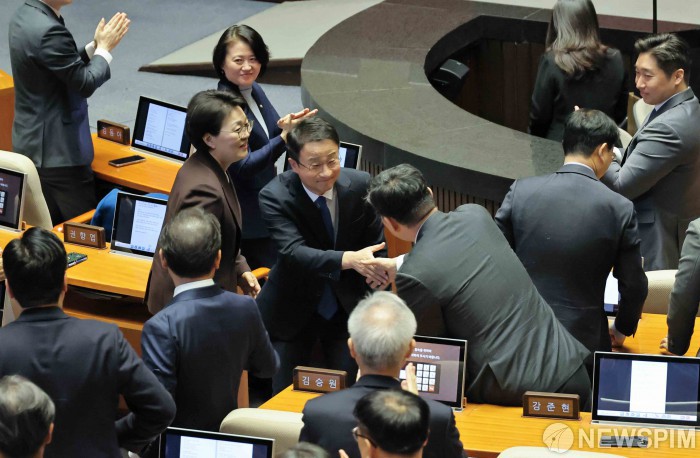 [서울=뉴스핌] 윤창빈 기자 = 한병도 더불어민주당 원내대표가 3일 서울 여의도 국회에서 열린 본회의에서 국정에 관한 교섭단체 대표연설을 마치고 나서며 동료 의원들의 박수를 받고 있다. 2026.02.03 pangbin@newspim.com