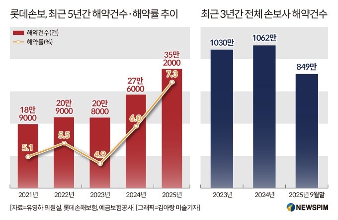 다만 업계 전반의 흐름과 비교하면 롯데손보의 해약은 증가 시점과 속도 면에서 상대적으로 두드러진다는 지적도 나온다. 예금보험공사에 따르면 전체 손해보험사의 해약건수는 2023년 1030만건, 2024년 1062만건, 2025년 9월 말 기준 849만건으로 집계돼, 업계 전체 차원에서 해약이 급격히 늘었다고 보기는 어렵다.