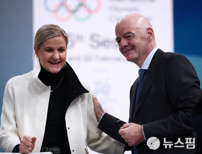 [밀라노 로이터=뉴스핌] 박상욱 기자= 잔니 인판티노 FIFA 회장(오른쪽)와 커스티 코번트리 IOC 회장이 3일 이탈리아 밀라노 MPC 오디토리엄에서 열린 제145차 IOC 총회를 앞두고 담소를 나누고 있다. 2026.2.3 psoq1337@newspim.com