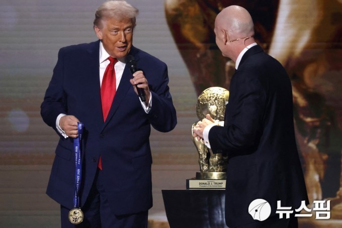 [워싱턴 로이터=뉴스핌] 박상욱 기자= 잔니 인판티노 FIFA 회장이 2025년 12월 북중미 월드컵 조 추첨 행사에서 트럼프 대통령에게 초대 FIFA 평화상을 수여하고 있다. 2025.12.6 psoq1337@newspim.com