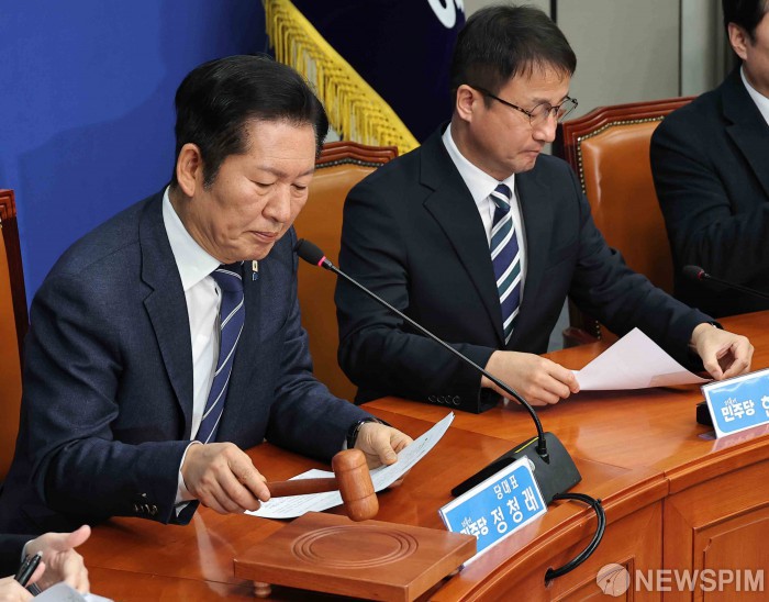 [서울=뉴스핌] 윤창빈 기자 = 정청래 더불어민주당 대표가 4일 서울 여의도 국회에서 열린 최고위원회의에서 의사봉을 두드리고 있다. 2026.02.04 pangbin@newspim.com