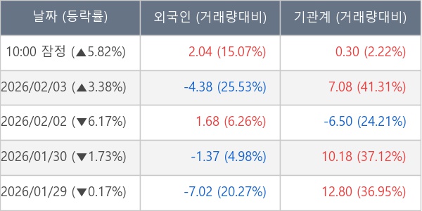 [서울=뉴스핌] 로보뉴스 = 04일 10시 15분 현재 동성화인텍(033500)은 외국인과 기관이 각각 2.04 만 주, 0.30 만 주 순매수(잠정) 하면서 전일 대비 5.82% (현재가 29,100원) 상승하고 있다.
