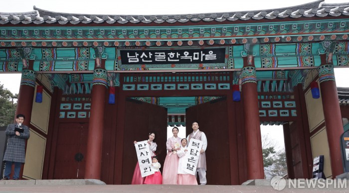 [서울=뉴스핌] 양윤모 기자 = 봄의 시작을 알리는 입춘(立春)을 맞아 4일 오전 서울 중구 남산골한옥마을이 '2026 세시절기 입춘(立春)' 행사를 진행했다. 행사는 지난 2016년 남산골한옥마을에서 전통혼례를 올린 가족과 웨딩사진을 촬영한 부부가 ‘입춘대길(立春大吉) 건양다경(建陽多慶)’ 등의 글귀를 대문에 써 붙이는 입춘첩 시연에 참여했다. 2026.02.04 yym58@newspim.com