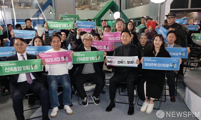 [서울=뉴스핌] 양윤모 기자 = 오세훈 서울시장이 4일 오후 서울 중구 서울도시건축전시관에서 개최된 주택정책소통관 집들이 및 소통의 날 행사에사전 공개 및 간담회 행사에 참석해 기념촬영을 하고 있다. 서울시는 미리내집과 신속통합기획, 모아주택 등 서울의 주택정책을 시민 눈높이에서 쉽고 친절하게 풀어주고 주거와 관련한 궁금증을 해결해 주는 전용공간으로 서울도시건축전시관 내 ‘주택정책소통관’을 개관한다. 2026.02.04 yym58@newspim.com