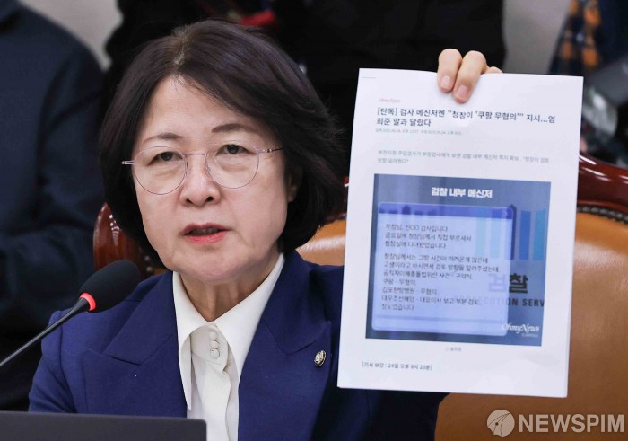 [서울=뉴스핌] 윤창빈 기자 = 추미애 국회 법제사법위원장이 4일 서울 여의도 국회에서 열린 법제사법위원회 전체회의에서 엄희준 검사와 관련한 자료를 들어보이고 있다. 2026.02.04 pangbin@newspim.com