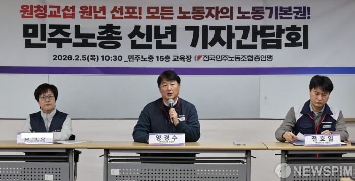 [서울=뉴스핌] 양윤모 기자 = 양경수 민주노총 위원장이 5일 오전 서울 중구 정동 민주노총 15층 교육장에서 개최된 '민주노총 2026 신년 기자간담회' 에 참석해 발언을 하고 있다. 엄미경 사무총장 직무대행,전호일 대변인,이겨레 부대변인 참석한 이날 행사에서 2026년을 원청 교섭, 초기업 교섭 쟁취 원년으로 모든 노동자의 노동기본권 쟁취하겠다는 민주노총의 과제 및 7월 총파업 투쟁 등 올해 계획을 밝혔다. 2026.02.05 yym58@newspim.com