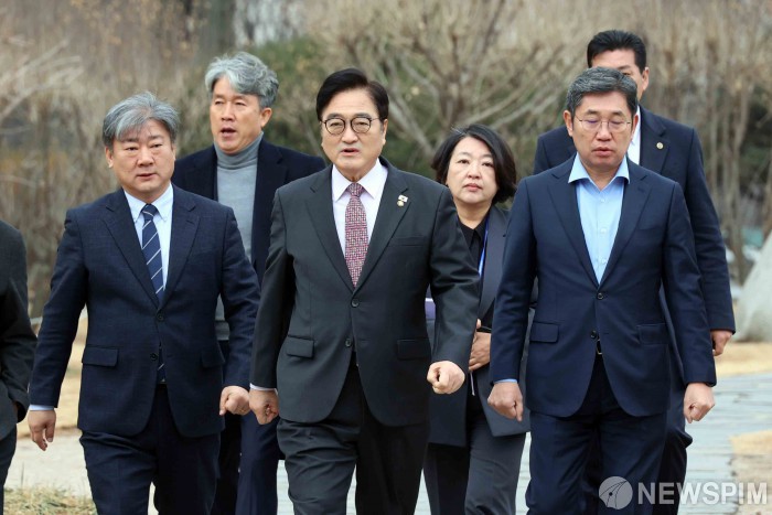 [서울=뉴스핌] 윤창빈 기자 = 우원식 국회의장이 5일 오전 국회 사랑재에서 열린 신년 기자회견에 참석하고 있다. 2026.02.05 pangbin@newspim.com