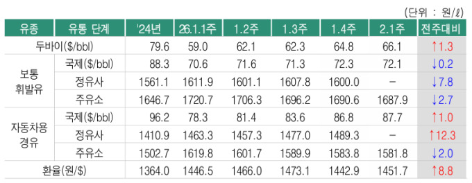 지난주(1월 4주) 정유사 휘발유 공급가격은 전주보다 7.8원 하락한 리터당 1600.0원, 경유 공급가격은 12.3원 상승한 리터당 1489.3원으로 집계됐다.