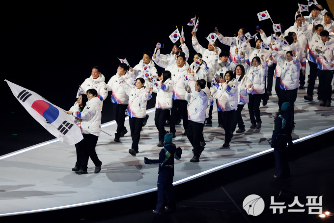 한국 선수단은 피겨스케이팅 남자 싱글 차준환(서울시청)과 스피드스케이팅 박지우(강원도청)가 공동 기수로 나서 밀라노에서 22번째로 입장했다.
